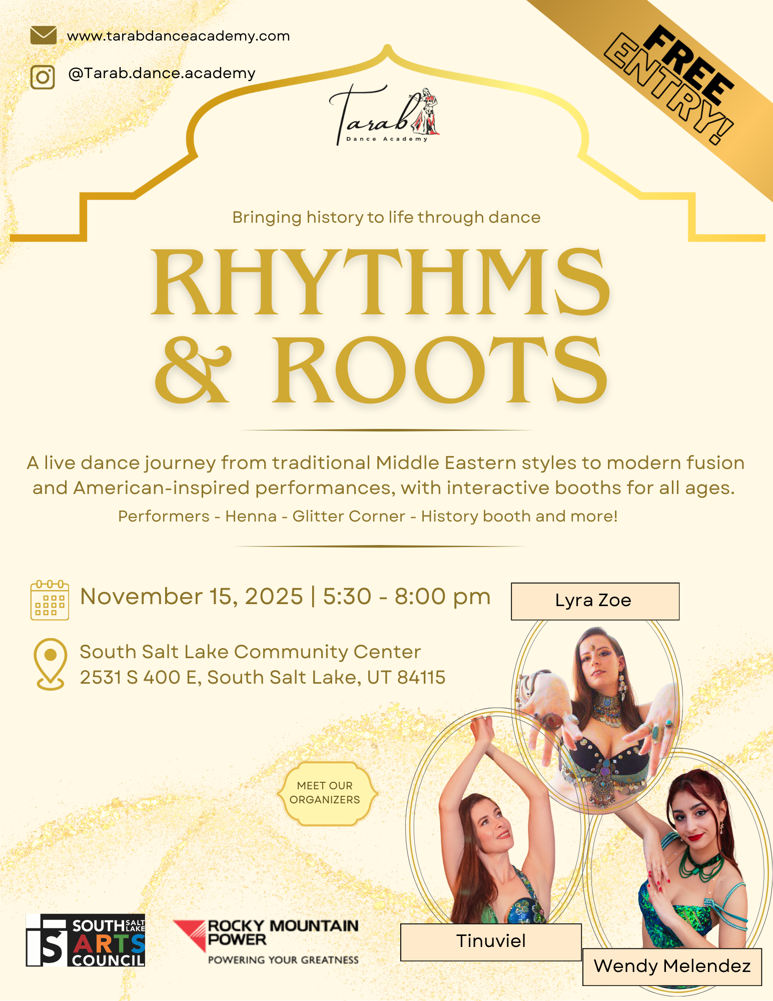 A collaboration between Tarab Dance Academy (directed by Wendy Melendez), Tinuviel and Lyra Zoe, and supported by the South Salt Lake Arts Council and Rocky Mountain Power, this event brings together creativity, culture, and community in one unforgettable night.